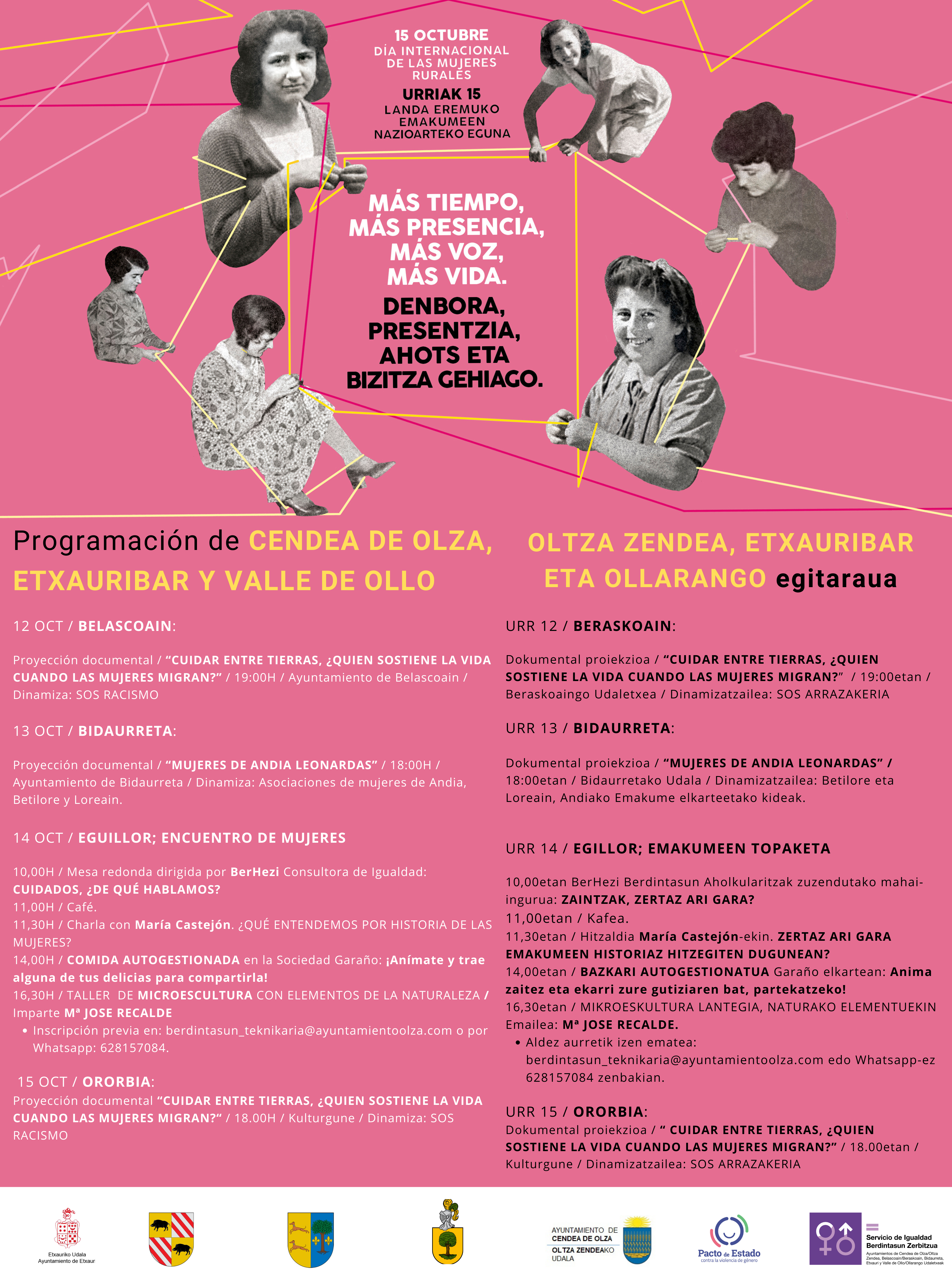 En conmemoración del Día Internacional de las Mujeres Rurales, que se celebra el 15 de octubre, y bajo el lema de “Más tiempo, más presencia, más voz, más vida”, la Red de Técnicas de Igualdad de Entidades Locales y Territoriales de Navarra hemos preparado una campaña conjunta en la queremos destacar la contribución de las mujeres del medio rural en el sistema de cuidados.